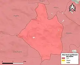 La commune est vulnérable au risque de mouvements de terrains constitué principalement du retrait-gonflement des sols argileux[21]. Cet aléa est susceptible d'engendrer des dommages importants aux bâtiments en cas d’alternance de périodes de sécheresse et de pluie. 99,9 % de la superficie communale est en aléa moyen ou fort (76,3 % au niveau départemental et 48,5 % au niveau national). Sur les 73 bâtiments dénombrés sur la commune en 2019, 73 sont en aléa moyen ou fort, soit 100 %, à comparer aux 90 % au niveau départemental et 54 % au niveau national. Une cartographie de l'exposition du territoire national au retrait gonflement des sols argileux est disponible sur le site du BRGM[22],[Carte 2].