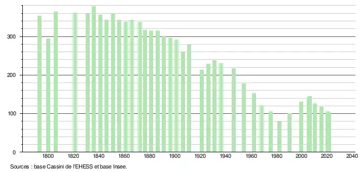 | L'évolution du nombre d'habitants est connue à travers les recensements de la population effectués dans la commune depuis 1793. Pour les communes de moins de 10 000 habitants, une enquête de recensement portant sur toute la population est réalisée tous les cinq ans, les populations légales des années intermédiaires étant quant à elles estimées par interpolation ou extrapolation[25]. Pour la commune, le premier recensement exhaustif entrant dans le cadre du nouveau dispositif a été réalisé en 2005[26]. En 2021, la commune comptait 103 habitants[Note 5], en diminution de 11,97 % par rapport à 2015 (Tarn : +1,82 %, France hors Mayotte : +1,84 %). |