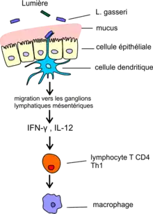 Une étude in vitro de cellules dendritiques myéloïdes humaines exposées à trois souches de lactobacilles (dont L. gasseri) a trouvé des sécrétions importantes de quelques cytokines : les interleukines IL-12 et IL-18 (mais pas de IL-10) mais aussi de l’interféron IFN-γ[10]. Ces substances de signalisation cellulaire agissent à distance sur les lymphocytes T CD4+ qui prolifèrent et dont une partie devient des lymphocytes T auxiliaires Th1. Ces derniers induisent une réponse immune cellulaire puissante.