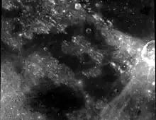 Lacus Gaudii, au centre de l'image, photographié par la sonde spatiale Clementine. En haut une partie de la mer de sérénité. En bas, à gauche du centre le lac Lenitatis et juste au-dessus le Lacus Hiemalis.