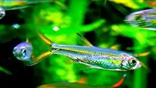 Cette espèce possède un fond de coloration argenté transparent à olivâtre le long de la ligne latérale, très légèrement orangé. La nageoire caudale en en forme de croissant et chacun des lobes est assez en pointes, bordées d’orange à orange vif. La nageoire dorsale est orange vif et surlignée de noir. La nageoire anale est orangée. Les nageoires pelviennes et pectorales sont translucides. L’œil est noir, l'opercule sanguine. La nageoire adipeuse est présente.