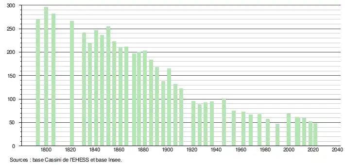 L'évolution du nombre d'habitants est connue à travers les recensements de la population effectués dans la commune depuis 1793. Pour les communes de moins de 10 000 habitants, une enquête de recensement portant sur toute la population est réalisée tous les cinq ans, les populations légales des années intermédiaires étant quant à elles estimées par interpolation ou extrapolation[15]. Pour la commune, le premier recensement exhaustif entrant dans le cadre du nouveau dispositif a été réalisé en 2007[16].