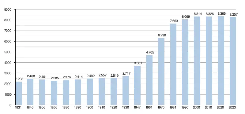 Elle comptait, au , 8 379 habitants (4 045 hommes et 4 334 femmes), soit une densité de 584,31 habitants/km²[7] pour une superficie de 14,34 km².