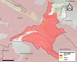 Le retrait-gonflement des sols argileux est susceptible d'engendrer des dommages importants aux bâtiments en cas d’alternance de périodes de sécheresse et de pluie. 78,2 % de la superficie communale est en aléa moyen ou fort (88,8 % au niveau départemental et 48,5 % au niveau national). Sur les 61 bâtiments dénombrés sur la commune en 2019, 44 sont en aléa moyen ou fort, soit 72 %, à comparer aux 98 % au niveau départemental et 54 % au niveau national. Une cartographie de l'exposition du territoire national au retrait gonflement des sols argileux est disponible sur le site du BRGM[28],[Carte 3].