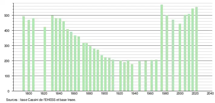 L'évolution du nombre d'habitants est connue à travers les recensements de la population effectués dans la commune depuis 1793. Pour les communes de moins de 10 000 habitants, une enquête de recensement portant sur toute la population est réalisée tous les cinq ans, les populations légales des années intermédiaires étant quant à elles estimées par interpolation ou extrapolation[27]. Pour la commune, le premier recensement exhaustif entrant dans le cadre du nouveau dispositif a été réalisé en 2006[28].