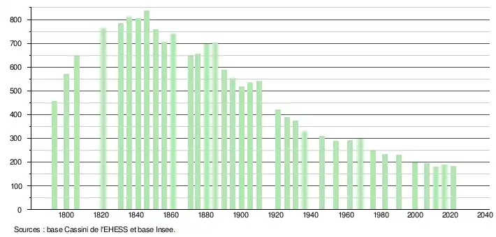 L'évolution du nombre d'habitants est connue à travers les recensements de la population effectués dans la commune depuis 1793. Pour les communes de moins de 10 000 habitants, une enquête de recensement portant sur toute la population est réalisée tous les cinq ans, les populations légales des années intermédiaires étant quant à elles estimées par interpolation ou extrapolation[22]. Pour la commune, le premier recensement exhaustif entrant dans le cadre du nouveau dispositif a été réalisé en 2006[23].