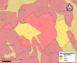 La commune est vulnérable au risque de mouvements de terrains constitué principalement du retrait-gonflement des sols argileux[22]. Cet aléa est susceptible d'engendrer des dommages importants aux bâtiments en cas d’alternance de périodes de sécheresse et de pluie. La totalité de la commune est en aléa moyen ou fort (76,3 % au niveau départemental et 48,5 % au niveau national). Sur les 106 bâtiments dénombrés sur la commune en 2019, 106 sont en aléa moyen ou fort, soit 100 %, à comparer aux 90 % au niveau départemental et 54 % au niveau national. Une cartographie de l'exposition du territoire national au retrait gonflement des sols argileux est disponible sur le site du BRGM[23],[Carte 3].