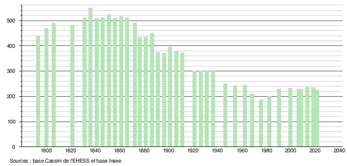 | L'évolution du nombre d'habitants est connue à travers les recensements de la population effectués dans la commune depuis 1793. Pour les communes de moins de 10 000 habitants, une enquête de recensement portant sur toute la population est réalisée tous les cinq ans, les populations légales des années intermédiaires étant quant à elles estimées par interpolation ou extrapolation[27]. Pour la commune, le premier recensement exhaustif entrant dans le cadre du nouveau dispositif a été réalisé en 2008[28]. En 2021, la commune comptait 225 habitants[Note 5], en diminution de 7,79 % par rapport à 2015 (Tarn : +1,82 %, France hors Mayotte : +1,84 %). |