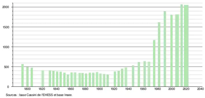 L'évolution du nombre d'habitants est connue à travers les recensements de la population effectués dans la commune depuis 1793. Pour les communes de moins de 10 000 habitants, une enquête de recensement portant sur toute la population est réalisée tous les cinq ans, les populations légales des années intermédiaires étant quant à elles estimées par interpolation ou extrapolation[35]. Pour la commune, le premier recensement exhaustif entrant dans le cadre du nouveau dispositif a été réalisé en 2008[36].