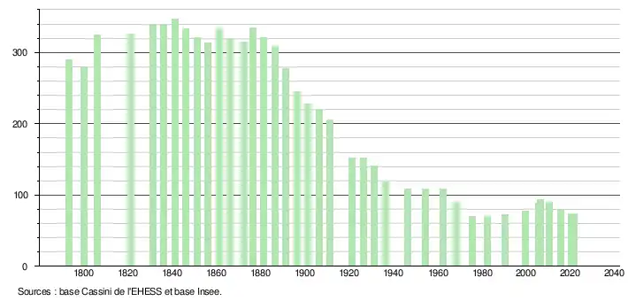 L'évolution du nombre d'habitants est connue à travers les recensements de la population effectués dans la commune depuis 1793. Pour les communes de moins de 10 000 habitants, une enquête de recensement portant sur toute la population est réalisée tous les cinq ans, les populations légales des années intermédiaires étant quant à elles estimées par interpolation ou extrapolation[15]. Pour la commune, le premier recensement exhaustif entrant dans le cadre du nouveau dispositif a été réalisé en 2005[16].
