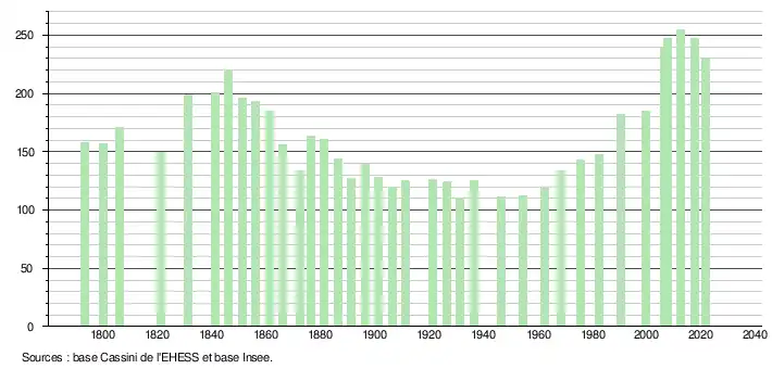 | L'évolution du nombre d'habitants est connue à travers les recensements de la population effectués dans la commune depuis 1793. Pour les communes de moins de 10 000 habitants, une enquête de recensement portant sur toute la population est réalisée tous les cinq ans, les populations légales des années intermédiaires étant quant à elles estimées par interpolation ou extrapolation[24]. Pour la commune, le premier recensement exhaustif entrant dans le cadre du nouveau dispositif a été réalisé en 2007[25]. En 2021, la commune comptait 230 habitants[Note 4], en diminution de 11,2 % par rapport à 2015 (Gers : +0,79 %, France hors Mayotte : +1,84 %). |
