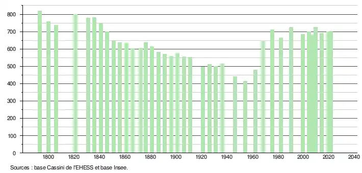 L'évolution du nombre d'habitants est connue à travers les recensements de la population effectués dans la commune depuis 1793. Pour les communes de moins de 10 000 habitants, une enquête de recensement portant sur toute la population est réalisée tous les cinq ans, les populations légales des années intermédiaires étant quant à elles estimées par interpolation ou extrapolation[45]. Pour la commune, le premier recensement exhaustif entrant dans le cadre du nouveau dispositif a été réalisé en 2004[46].