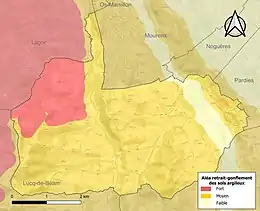 Le retrait-gonflement des sols argileux est susceptible d'engendrer des dommages importants aux bâtiments en cas d’alternance de périodes de sécheresse et de pluie[31]. 93,8 % de la superficie communale est en aléa moyen ou fort (59 % au niveau départemental et 48,5 % au niveau national)[Carte 4]. Depuis le , en application de la loi ELAN, différentes contraintes s'imposent aux vendeurs, maîtres d'ouvrages ou constructeurs de biens situés dans une zone classée en aléa moyen ou fort[Note 7],[32].