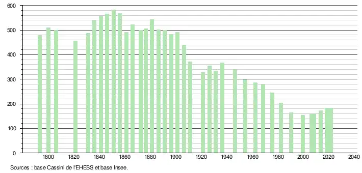 L'évolution du nombre d'habitants est connue à travers les recensements de la population effectués dans la commune depuis 1793. Pour les communes de moins de 10 000 habitants, une enquête de recensement portant sur toute la population est réalisée tous les cinq ans, les populations légales des années intermédiaires étant quant à elles estimées par interpolation ou extrapolation[15]. Pour la commune, le premier recensement exhaustif entrant dans le cadre du nouveau dispositif a été réalisé en 2008[16].