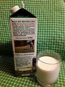Le lait de foin est apparu en Autriche en 2009 sous l'appellation Heumilch. Au niveau européen, une appellation « Spécialité traditionnelle garantie » (STG) a été déposée auprès de l'Institut national de l'origine et de la qualité[1]. Le label STG est créé en 2016 pour le lait de vache, avec un cahier des charges respectant celui des éleveurs autrichiens et depuis mars 2019 pour le lait de chèvre ainsi que le lait de brebis[2]. Il s'agit de la première STG laitière, mais la deuxième STG française après « les moules de bouchot »[pas clair][réf. nécessaire].