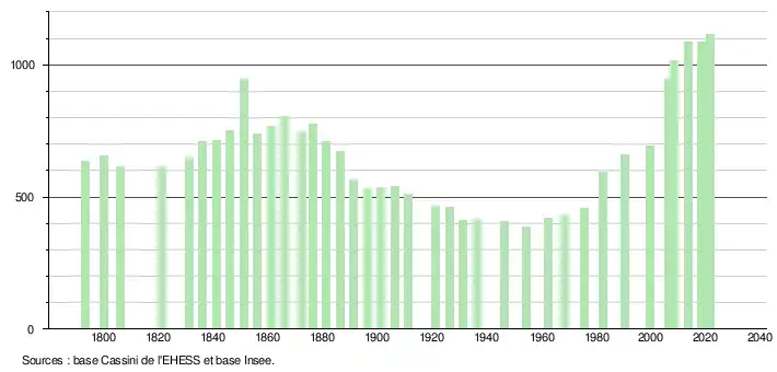 L'évolution du nombre d'habitants est connue à travers les recensements de la population effectués dans la commune depuis 1793. Pour les communes de moins de 10 000 habitants, une enquête de recensement portant sur toute la population est réalisée tous les cinq ans, les populations légales des années intermédiaires étant quant à elles estimées par interpolation ou extrapolation[16]. Pour la commune, le premier recensement exhaustif entrant dans le cadre du nouveau dispositif a été réalisé en 2008[17].