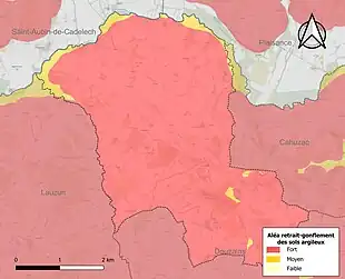 Le retrait-gonflement des sols argileux est susceptible d'engendrer des dommages importants aux bâtiments en cas d’alternance de périodes de sécheresse et de pluie[18]. 99,8 % de la superficie communale est en aléa moyen ou fort (91,8 % au niveau départemental et 48,5 % au niveau national)[Carte 2]. Depuis le , en application de la loi ELAN, différentes contraintes s'imposent aux vendeurs, maîtres d'ouvrages ou constructeurs de biens situés dans une zone classée en aléa moyen ou fort[Note 2],[19].
