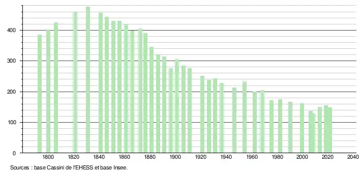 L'évolution du nombre d'habitants est connue à travers les recensements de la population effectués dans la commune depuis 1793. Pour les communes de moins de 10 000 habitants, une enquête de recensement portant sur toute la population est réalisée tous les cinq ans, les populations légales des années intermédiaires étant quant à elles estimées par interpolation ou extrapolation[27]. Pour la commune, le premier recensement exhaustif entrant dans le cadre du nouveau dispositif a été réalisé en 2008[28].