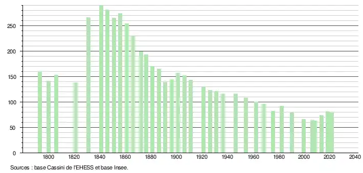 | L'évolution du nombre d'habitants est connue à travers les recensements de la population effectués dans la commune depuis 1793. Pour les communes de moins de 10 000 habitants, une enquête de recensement portant sur toute la population est réalisée tous les cinq ans, les populations légales des années intermédiaires étant quant à elles estimées par interpolation ou extrapolation[31]. Pour la commune, le premier recensement exhaustif entrant dans le cadre du nouveau dispositif a été réalisé en 2008[32]. En 2021, la commune comptait 79 habitants[Note 5], en diminution de 1,25 % par rapport à 2015 (Gers : +0,79 %, France hors Mayotte : +1,84 %). |