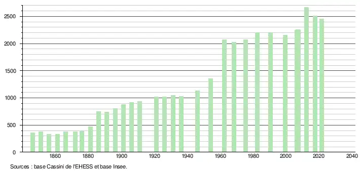 - Population municipale légale en vigueur au 1er janvier 2024, millésimée 2021, définie dans les limites territoriales en vigueur au 1er janvier 2023, date de référence statistique : 1er janvier 2021.