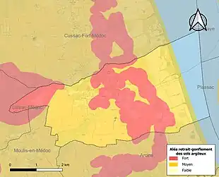Le retrait-gonflement des sols argileux est susceptible d'engendrer des dommages importants aux bâtiments en cas d’alternance de périodes de sécheresse et de pluie. 86,3 % de la superficie communale est en aléa moyen ou fort (67,4 % au niveau départemental et 48,5 % au niveau national). Sur les 544 bâtiments dénombrés sur la commune en 2019, 544 sont en aléa moyen ou fort, soit 100 %, à comparer aux 84 % au niveau départemental et 54 % au niveau national. Une cartographie de l'exposition du territoire national au retrait gonflement des sols argileux est disponible sur le site du BRGM[17],[Carte 2].