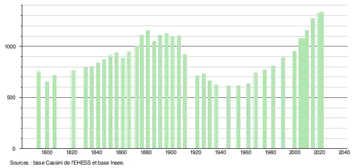 L'évolution du nombre d'habitants est connue à travers les recensements de la population effectués dans la commune depuis 1793. Pour les communes de moins de 10 000 habitants, une enquête de recensement portant sur toute la population est réalisée tous les cinq ans, les populations légales des années intermédiaires étant quant à elles estimées par interpolation ou extrapolation[22]. Pour la commune, le premier recensement exhaustif entrant dans le cadre du nouveau dispositif a été réalisé en 2004[23].