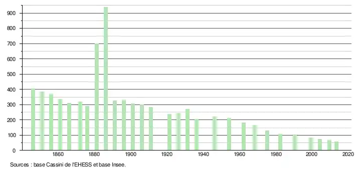 L'évolution du nombre d'habitants est connue à travers les recensements de la population effectués dans la commune depuis 1846. À partir du , les populations légales des communes sont publiées annuellement dans le cadre d'un recensement qui repose désormais sur une collecte d'information annuelle, concernant successivement tous les territoires communaux au cours d'une période de cinq ans. Pour les communes de moins de 10 000 habitants, une enquête de recensement portant sur toute la population est réalisée tous les cinq ans, les populations légales des années intermédiaires étant quant à elles estimées par interpolation ou extrapolation[6]. Pour la commune, le premier recensement exhaustif entrant dans le cadre du nouveau dispositif a été réalisé en 2004[7],[Note 1].