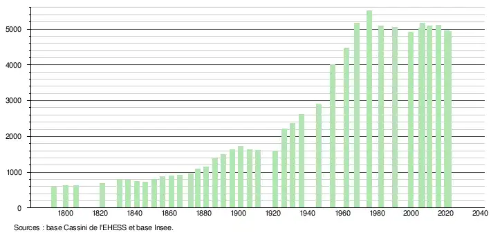 L'évolution du nombre d'habitants est connue à travers les recensements de la population effectués dans la commune depuis 1793. Pour les communes de moins de 10 000 habitants, une enquête de recensement portant sur toute la population est réalisée tous les cinq ans, les populations légales des années intermédiaires étant quant à elles estimées par interpolation ou extrapolation[29]. Pour la commune, le premier recensement exhaustif entrant dans le cadre du nouveau dispositif a été réalisé en 2005[30].