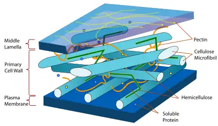 La lamelle moyenne est principalement constituée de pectine[1]. Elle est perforée aux endroits où passent les plasmodesmes[3].