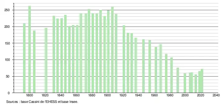 L'évolution du nombre d'habitants est connue à travers les recensements de la population effectués dans la commune depuis 1793. Pour les communes de moins de 10 000 habitants, une enquête de recensement portant sur toute la population est réalisée tous les cinq ans, les populations légales des années intermédiaires étant quant à elles estimées par interpolation ou extrapolation[16]. Pour la commune, le premier recensement exhaustif entrant dans le cadre du nouveau dispositif a été réalisé en 2008[17].