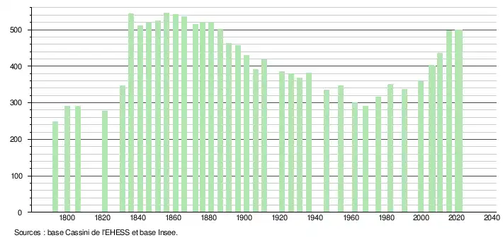 | L'évolution du nombre d'habitants est connue à travers les recensements de la population effectués dans la commune depuis 1793. Pour les communes de moins de 10 000 habitants, une enquête de recensement portant sur toute la population est réalisée tous les cinq ans, les populations légales des années intermédiaires étant quant à elles estimées par interpolation ou extrapolation[29]. Pour la commune, le premier recensement exhaustif entrant dans le cadre du nouveau dispositif a été réalisé en 2005[30]. En 2021, la commune comptait 499 habitants[Note 5], en augmentation de 0,4 % par rapport à 2015 (Tarn : +1,82 %, France hors Mayotte : +1,84 %). |