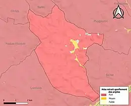 La commune est vulnérable au risque de mouvements de terrains constitué principalement du retrait-gonflement des sols argileux[24]. Cet aléa est susceptible d'engendrer des dommages importants aux bâtiments en cas d’alternance de périodes de sécheresse et de pluie. 99,4 % de la superficie communale est en aléa moyen ou fort (76,3 % au niveau départemental et 48,5 % au niveau national). Sur les 209 bâtiments dénombrés sur la commune en 2019, 209 sont en aléa moyen ou fort, soit 100 %, à comparer aux 90 % au niveau départemental et 54 % au niveau national. Une cartographie de l'exposition du territoire national au retrait gonflement des sols argileux est disponible sur le site du BRGM[25],[Carte 3].