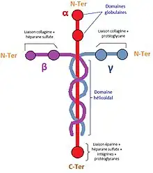 Les laminines sont composées par l’assemblage de 3 chaînes polypeptidiques : α (alpha), β (bêta) et γ (gamma). Ces trois chaines, codées par des gènes distincts, sont reliées entre elles par des ponts disulfures[4]. Les laminines ont une morphologie en croix asymétrique avec trois bras courts et un bras long. Les extrémités N-terminal et C-terminal correspondent respectivement aux bras courts et au bras long (cf. schéma).