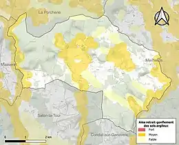 Le retrait-gonflement des sols argileux est susceptible d'engendrer des dommages importants aux bâtiments en cas d’alternance de périodes de sécheresse et de pluie. 27,9 % de la superficie communale est en aléa moyen ou fort (26,8 % au niveau départemental et 48,5 % au niveau national). Sur les 101 bâtiments dénombrés sur la commune en 2019, 35 sont en aléa moyen ou fort, soit 35 %, à comparer aux 36 % au niveau départemental et 54 % au niveau national. Une cartographie de l'exposition du territoire national au retrait gonflement des sols argileux est disponible sur le site du BRGM[24],[Carte 2].
