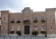 Construite de 1860 à 1862[réf. nécessaire], la mairie présente une façade évoquant celle d'un château-médiéval. Sa construction fut largement financée, comme l'église, par une forte participation personnelle de Napoléon III[réf. nécessaire]. Les plans primitifs prévoyaient la réalisation d'un ensemble administratif complet comprenant mairie, salle de justice de paix et école, mais la chute du Second Empire en septembre 1870, en mettant fin à la générosité impériale, fit abandonner ce projet ambitieux qui se limita à la construction de la seule mairie[réf. nécessaire].