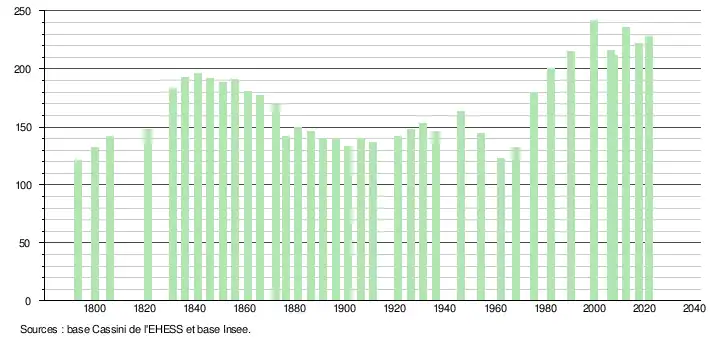 L'évolution du nombre d'habitants est connue à travers les recensements de la population effectués dans la commune depuis 1793. Pour les communes de moins de 10 000 habitants, une enquête de recensement portant sur toute la population est réalisée tous les cinq ans, les populations légales des années intermédiaires étant quant à elles estimées par interpolation ou extrapolation[19]. Pour la commune, le premier recensement exhaustif entrant dans le cadre du nouveau dispositif a été réalisé en 2007[20].