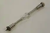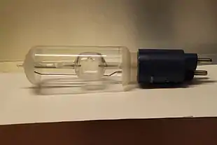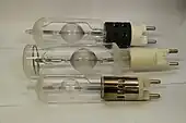 Les lampes aux halogénures métalliques sont des lampes à arc de taille moyenne avec cycle halogène. Elles sont relativement similaires aux lampes à vapeur de mercure mais les éléments constitutifs sont différents. L'ampoule est composée d'une sphère (le bulbe) en quartz[13] résistant à la pression (35 bars)[13] et à la température (950 °C)[13] et de forte épaisseur (jusqu'à mm)[13] associée à deux longues électrodes[13].