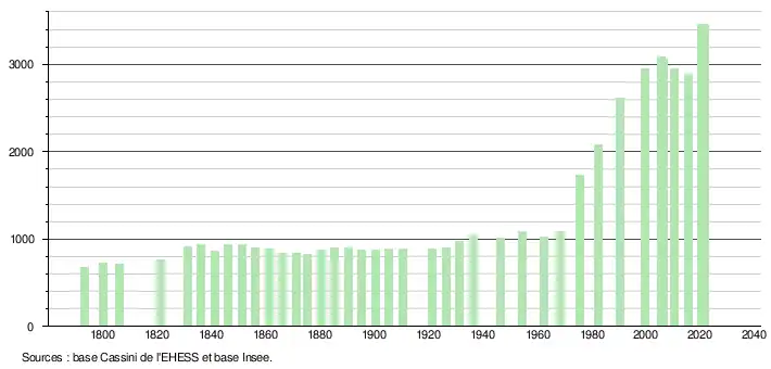 L'évolution du nombre d'habitants est connue à travers les recensements de la population effectués dans la commune depuis 1793. Pour les communes de moins de 10 000 habitants, une enquête de recensement portant sur toute la population est réalisée tous les cinq ans, les populations légales des années intermédiaires étant quant à elles estimées par interpolation ou extrapolation[22]. Pour la commune, le premier recensement exhaustif entrant dans le cadre du nouveau dispositif a été réalisé en 2005[23].