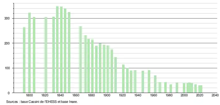 L'évolution du nombre d'habitants est connue à travers les recensements de la population effectués dans la commune depuis 1793. Pour les communes de moins de 10 000 habitants, une enquête de recensement portant sur toute la population est réalisée tous les cinq ans, les populations légales des années intermédiaires étant quant à elles estimées par interpolation ou extrapolation[17]. Pour la commune, le premier recensement exhaustif entrant dans le cadre du nouveau dispositif a été réalisé en 2004[18].