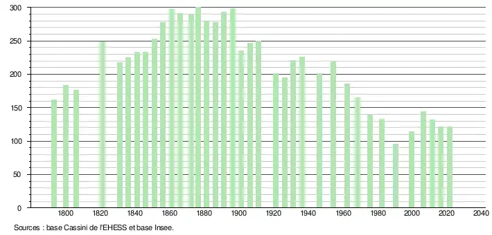 L'évolution du nombre d'habitants est connue à travers les recensements de la population effectués dans la commune depuis 1793. Pour les communes de moins de 10 000 habitants, une enquête de recensement portant sur toute la population est réalisée tous les cinq ans, les populations légales des années intermédiaires étant quant à elles estimées par interpolation ou extrapolation[22]. Pour la commune, le premier recensement exhaustif entrant dans le cadre du nouveau dispositif a été réalisé en 2006[23].