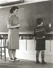 Une nouvelle enseignante de Landaff dans les années 1940 regarde un élève écrire au tableau.