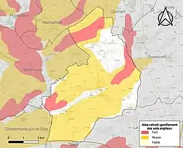 Le retrait-gonflement des sols argileux est susceptible d'engendrer des dommages importants aux bâtiments en cas d’alternance de périodes de sécheresse et de pluie. 75,5 % de la superficie communale est en aléa moyen ou fort (54,2 % au niveau départemental et 48,5 % au niveau national). Sur les 333 bâtiments dénombrés sur la commune en 2019, 265 sont en aléa moyen ou fort, soit 80 %, à comparer aux 57 % au niveau départemental et 54 % au niveau national. Une cartographie de l'exposition du territoire national au retrait gonflement des sols argileux est disponible sur le site du BRGM[15],[Carte 2].