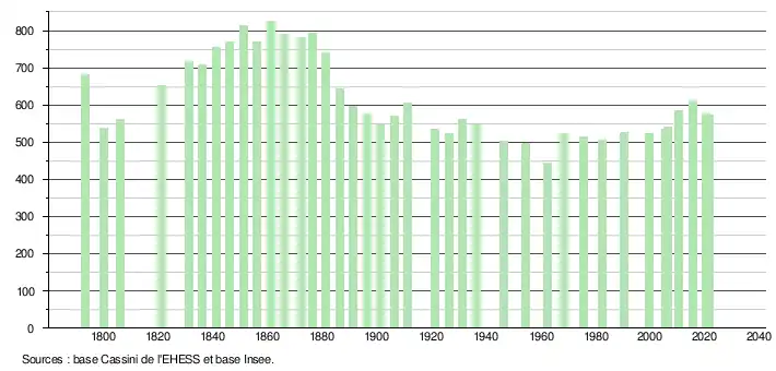 L'évolution du nombre d'habitants est connue à travers les recensements de la population effectués dans la commune depuis 1793. Pour les communes de moins de 10 000 habitants, une enquête de recensement portant sur toute la population est réalisée tous les cinq ans, les populations légales des années intermédiaires étant quant à elles estimées par interpolation ou extrapolation[18]. Pour la commune, le premier recensement exhaustif entrant dans le cadre du nouveau dispositif a été réalisé en 2005[19].