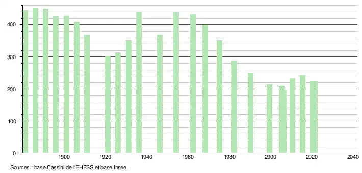 L'évolution du nombre d'habitants est connue à travers les recensements de la population effectués dans la commune depuis 1881. Pour les communes de moins de 10 000 habitants, une enquête de recensement portant sur toute la population est réalisée tous les cinq ans, les populations légales des années intermédiaires étant quant à elles estimées par interpolation ou extrapolation[26]. Pour la commune, le premier recensement exhaustif entrant dans le cadre du nouveau dispositif a été réalisé en 2005[27].
