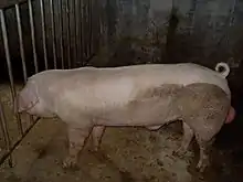 C'est un porc de grande taille, reconnaissable à ses grandes oreilles retombantes dirigées vers l'avant. Le corps est allongé, fusiforme. La robe est uniformément blanche, avec peu de poils[4].