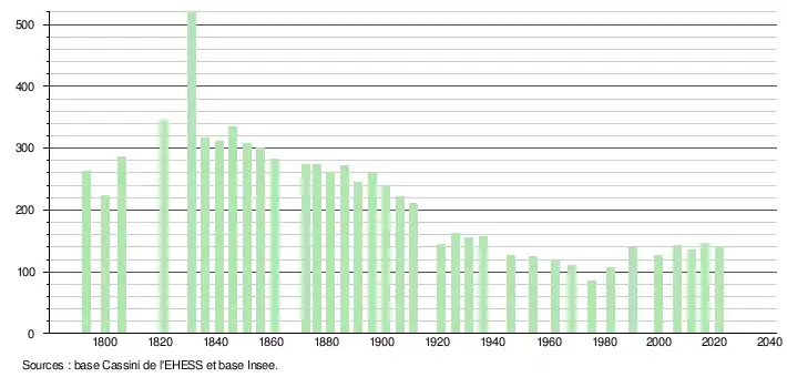L'évolution du nombre d'habitants est connue à travers les recensements de la population effectués dans la commune depuis 1793. Pour les communes de moins de 10 000 habitants, une enquête de recensement portant sur toute la population est réalisée tous les cinq ans, les populations légales des années intermédiaires étant quant à elles estimées par interpolation ou extrapolation[16]. Pour la commune, le premier recensement exhaustif entrant dans le cadre du nouveau dispositif a été réalisé en 2006[17].