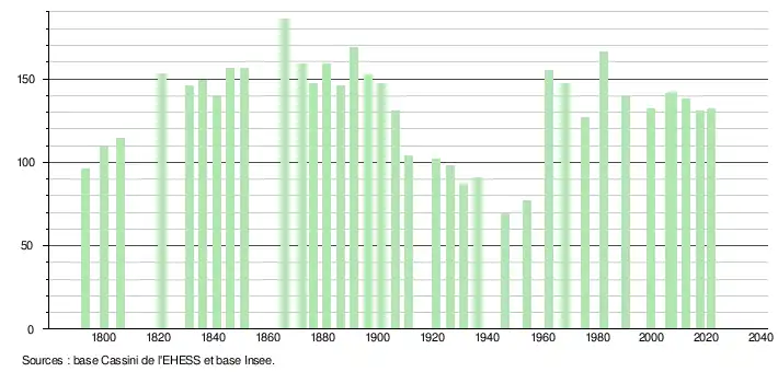 L'évolution du nombre d'habitants est connue à travers les recensements de la population effectués dans la commune depuis 1793. Pour les communes de moins de 10 000 habitants, une enquête de recensement portant sur toute la population est réalisée tous les cinq ans, les populations légales des années intermédiaires étant quant à elles estimées par interpolation ou extrapolation[21]. Pour la commune, le premier recensement exhaustif entrant dans le cadre du nouveau dispositif a été réalisé en 2007[22].