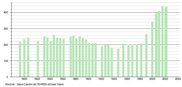 L'évolution du nombre d'habitants est connue à travers les recensements de la population effectués dans la commune depuis 1793. Pour les communes de moins de 10 000 habitants, une enquête de recensement portant sur toute la population est réalisée tous les cinq ans, les populations légales des années intermédiaires étant quant à elles estimées par interpolation ou extrapolation[22]. Pour la commune, le premier recensement exhaustif entrant dans le cadre du nouveau dispositif a été réalisé en 2005[23].