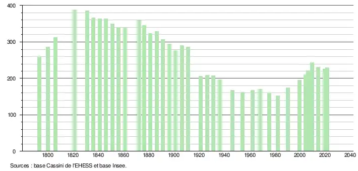 L'évolution du nombre d'habitants est connue à travers les recensements de la population effectués dans la commune depuis 1793. Pour les communes de moins de 10 000 habitants, une enquête de recensement portant sur toute la population est réalisée tous les cinq ans, les populations légales des années intermédiaires étant quant à elles estimées par interpolation ou extrapolation[17]. Pour la commune, le premier recensement exhaustif entrant dans le cadre du nouveau dispositif a été réalisé en 2004[18].