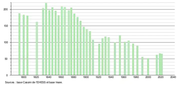 L'évolution du nombre d'habitants est connue à travers les recensements de la population effectués dans la commune depuis 1793. Pour les communes de moins de 10 000 habitants, une enquête de recensement portant sur toute la population est réalisée tous les cinq ans, les populations légales des années intermédiaires étant quant à elles estimées par interpolation ou extrapolation[8]. Pour la commune, le premier recensement exhaustif entrant dans le cadre du nouveau dispositif a été réalisé en 2008[9].